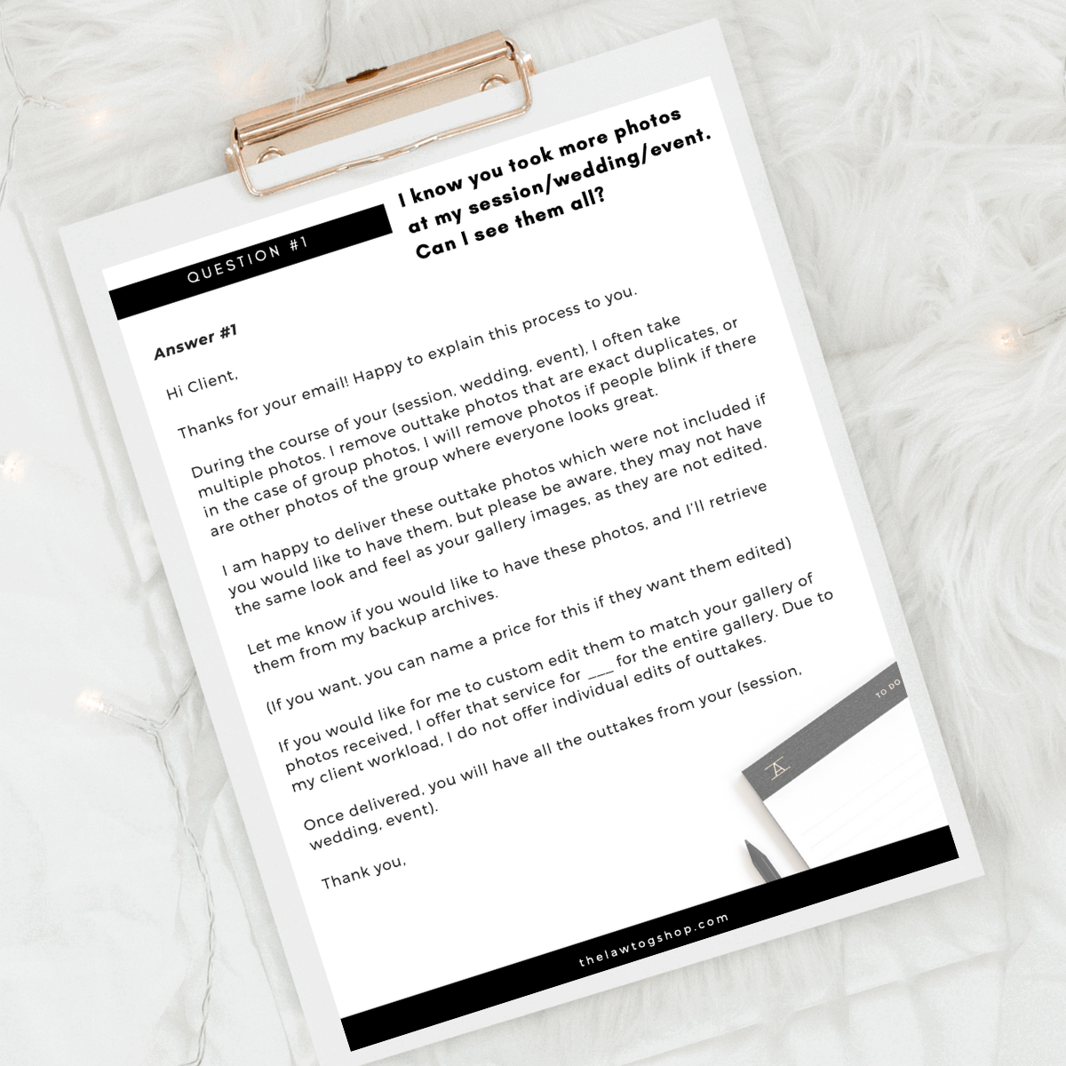 We worked together with some of the top photographers in the industry to come up with ten of the top client issues facing photographers. Then we created lawyer drafted responses that will help you set your boundaries and avoid client issues when facing these problems. You will never have to stress out for hours on end, posting in Facebook groups and hoping for a miracle answer to your client problems. We have the answer for you right here!