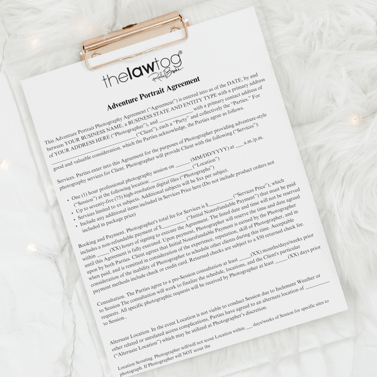 TheLawTog®’s contract forms are drafted on general American law-based contract principles and are applicable to many states. Due to variations in law based on location and business policies, the contracts are editable and easily adaptable. If you are a photographer outside the US, the policies may be implemented for your business, but U.S. Federal Copyright laws and other legal theories may not apply. For example, in the United States, unless otherwise contracted, the photographer retains copyright ownership of images. However, in other countries, the law may give the copyright ownership to the client and necessitate a provision for transfer.