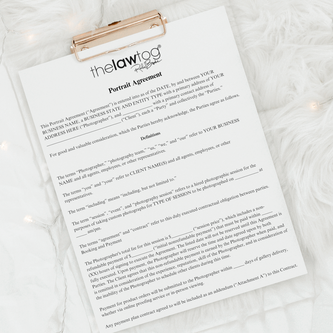 TheLawTog®’s contract forms are drafted on general American law-based contract principles and are applicable to many states. Due to variations in law based on location and business policies, the contracts are editable and easily adaptable. If you are a photographer outside the US, the policies may be implemented for your business, but U.S. Federal Copyright laws and other legal theories may not apply. For example, in the United States, unless otherwise contracted, the photographer retains copyright ownership of images. However, in other countries, the law may give the copyright ownership to the client and necessitate a provision for transfer.